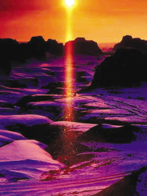 戈壁上沒有高大的樹木可以乘涼,沒有飯菜可供充饑,更沒有水源能夠解渴,唐軍一時間陷入了絕境。正在此時突然發(fā)現(xiàn)前方有一潭碧水,湖邊楊柳搖曳,屋舍成排,將軍和士兵便拼命地朝著湖水奔跑而去。可是他們跑得越快水也就遠(yuǎn)去得越快,湖水瞬間消失了,面前仍舊是熾熱的戈壁,將士們正在悲痛,突然前方又出現(xiàn)了一潭湖水,鱗波蕩漾,將士們再度狂奔。