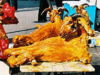 在新疆與北京烤鴨媲美的名貴菜肴就是烤全羊,是維吾爾族的一大傳統(tǒng)名肴。在烏魯木齊、喀什、和田等地的巴扎爾都可聞到它特有的香味。烤全羊不僅是街頭的風(fēng)味小吃,而且也是維吾爾人招待貴客的上等佳肴,現(xiàn)在也成為高級(jí)筵席中的