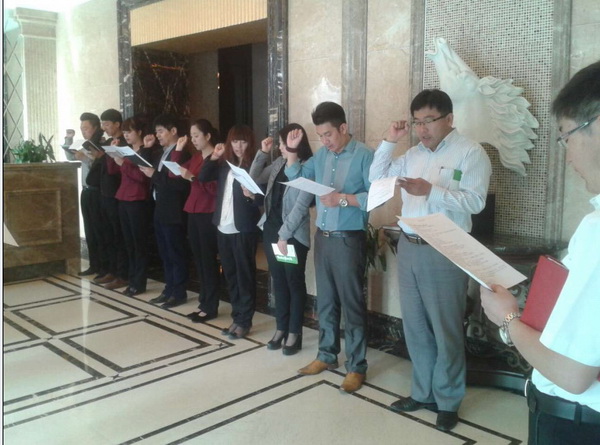 晨會分為三大部分:首先從振奮人心的團隊口號開始,讓大家精神抖擻,一天都保有高昂的工作狀態(tài);其次是工作目標的陳述,讓每一位員工明確每天的任務并為之努力完成;最后大家共同宣言,堅定信念,勢必要將營銷工作推向新的高度。
