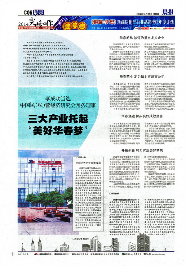10月30日的《晨報(bào)》于C06版用整版篇幅,以“李成功當(dāng)選中國民(私)營經(jīng)濟(jì)研究會(huì)常務(wù)理事,三大產(chǎn)業(yè)托起美好華春夢”為題,對華春大業(yè)進(jìn)行了專題報(bào)道。