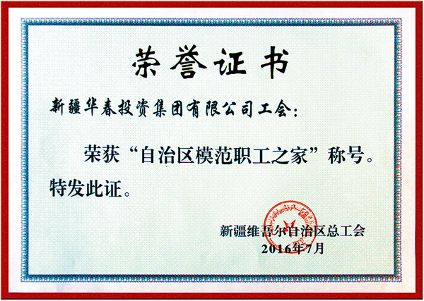 華春集團(tuán)工會(huì)的典型事跡被定為培訓(xùn)全國(guó)工會(huì)干部的教材,獲得諸多榮譽(yù),被烏魯木齊市總工會(huì)授予“模范職工之家”、被新疆自治區(qū)總工會(huì)、人力資源和社會(huì)保障廳等授予“自治區(qū)模范勞動(dòng)關(guān)系和諧企業(yè)”、被全國(guó)總工會(huì)、全國(guó)工商聯(lián)、人力資源社會(huì)保障部授予“全國(guó)就業(yè)與社會(huì)保障先進(jìn)民營(yíng)企業(yè)”、被全國(guó)總工會(huì)、發(fā)展改革委、科技部授予全國(guó)“講理想、比貢獻(xiàn)”先進(jìn)集體等榮譽(yù)稱(chēng)號(hào)。