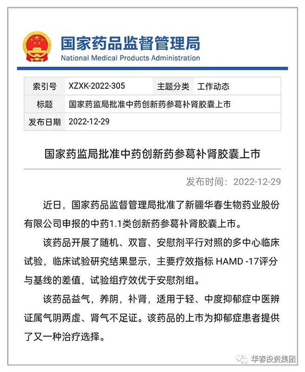 2022年12月29日,這是全疆全國醫藥界值得慶賀的重大喜慶日子!新疆華春生物藥業股份有限公司(以下簡稱:華春藥業)向國家藥監局申報的國家十三五“國家重大新藥創制·科技重大專項”抗抑郁癥 1.1類中藥創新藥“參葛補腎膠囊”獲批上市!這是全國醫藥界可喜可賀的盛事!更是新疆醫藥界國家1類創新藥!開創了新疆擁有國家1類創新藥的新紀元!