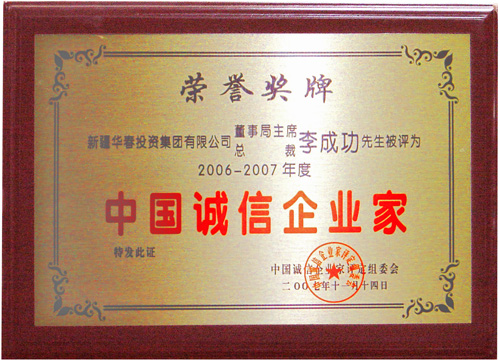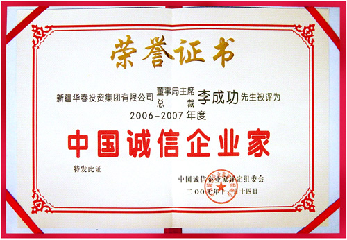 新疆華春集團總裁李成功先生經中國誠信企業家評定組委會的初審、復審及公示,被評為2006-2007年度中國誠信企業家,于2008年剛剛開啟之際,為李成功先生頒發了榮譽證書和獎牌。
