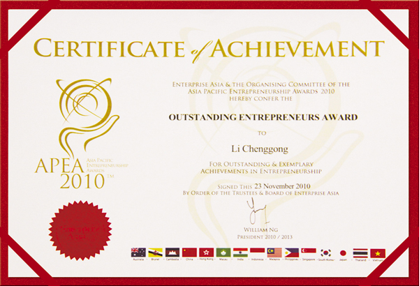 亞太企業(yè)精神獎(jiǎng)(APEA),即對(duì)亞太區(qū)域內(nèi)在建立成功企業(yè)過程中,以堅(jiān)毅精神取得卓越成就、并注重企業(yè)社會(huì)責(zé)任的企業(yè)家們給予的最高獎(jiǎng)項(xiàng)。亞太企業(yè)精神獎(jiǎng)在中國(guó)是首次進(jìn)行評(píng)選,經(jīng)過半年的時(shí)間,通過對(duì)國(guó)內(nèi)企業(yè)的層層篩選、實(shí)地考察、面對(duì)面的訪談,最終遴選出了符合APEA標(biāo)準(zhǔn)的企業(yè),經(jīng)過國(guó)際顧問委員會(huì)的綜合評(píng)審,評(píng)選出10位企業(yè)發(fā)展良好與盡心、盡責(zé)的卓越企業(yè)家。