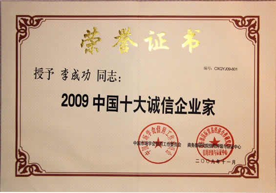 “2009中國十大誠信企業家”榮譽證書
